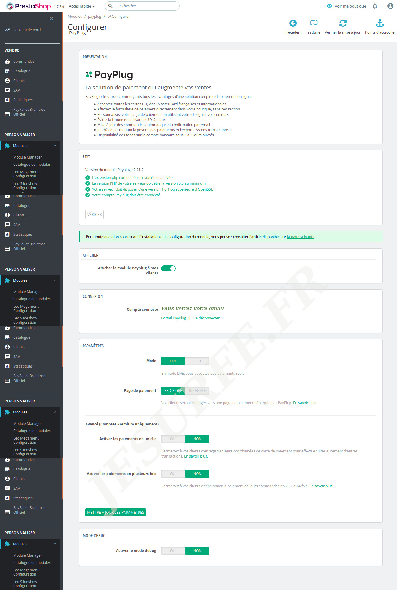 Depuis votre e-Commerce PrestaShop, rdv dans le module Payplug. Connectez le module à votre compte Payplug puis configurez-le comme indiqué sur l’image ci-dessous :
